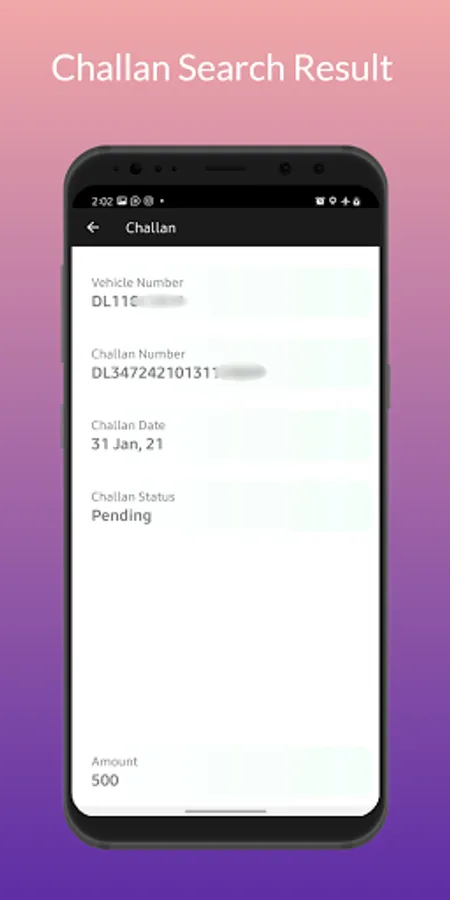 Challan Search: It provides Information about Challan available on the vehicle and the date of the payment. User Have to enter the Vehicle number in the search box