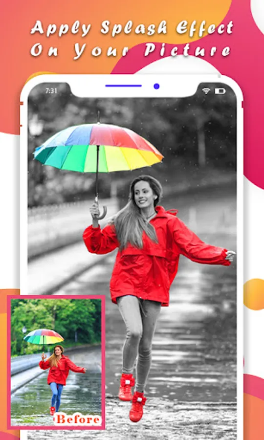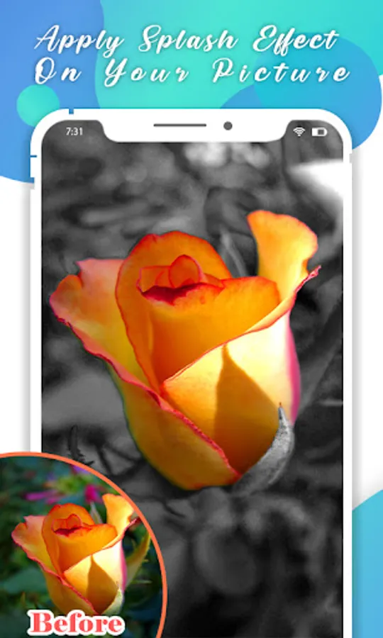 Color splash allows the recoloring images and apply cool photo effects to them. Apply this color splash effect on the image to edit and play with color magic. Color Splash effect with these amazing-looking filters and advanced photo color features like Zoom Photos, Photo Brush Size to add color splash effects and also undo and redo along with color splash touch effects.