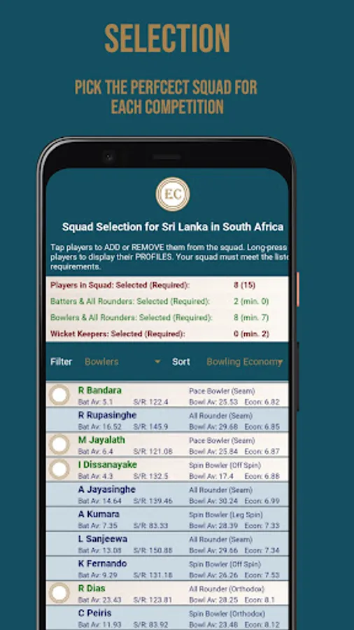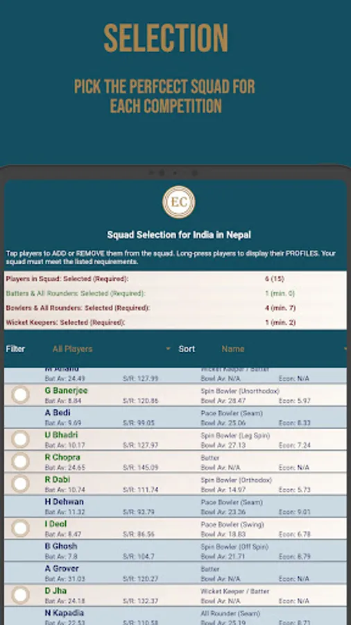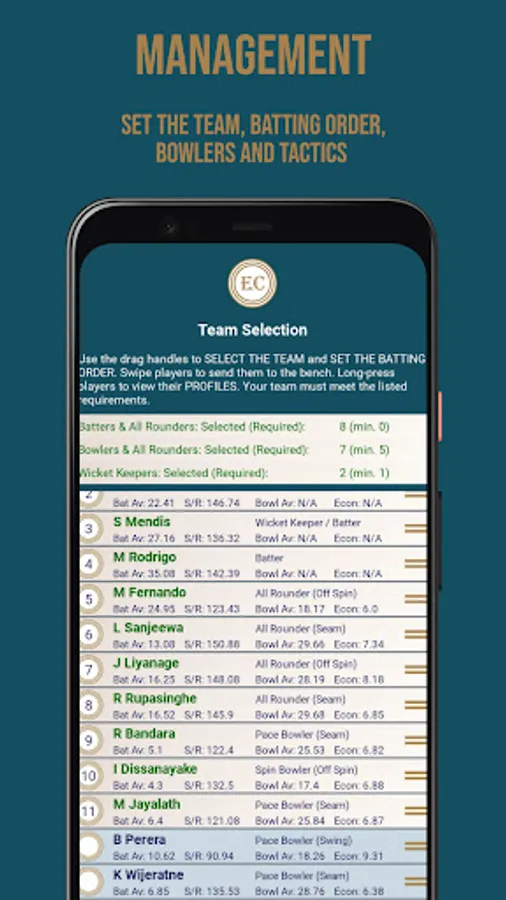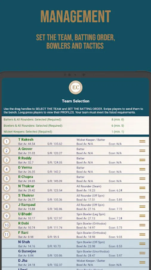 Select your squad for each tournament from a varied pool of players. From accumulators to sloggers and right-arm quicks to left-arm wrist spinners, they’re all available for you to create the perfect group to challenge for each competition. You can dig into the detailed player stats to assist your selections, and track player performance throughout the tournament.
