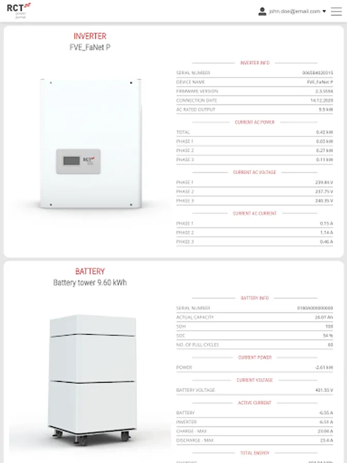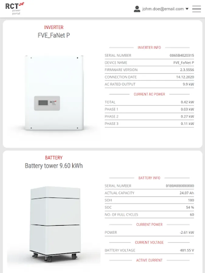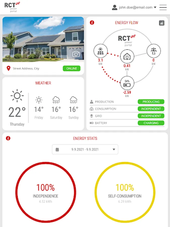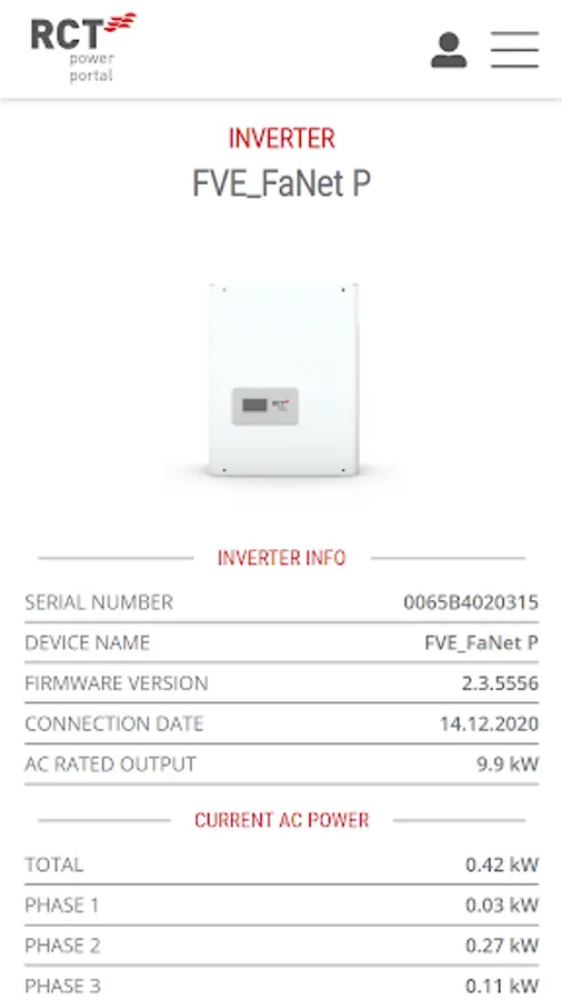 The RCT Power Portal App is a tool for PV systems online monitoring which uses products of company RCT Power GmbH. Application enables to monitor actual PV system generation, consumption of the electricity, daily and total electricity generation and self-consumption overview and environmental benefit contribution equivalent.
