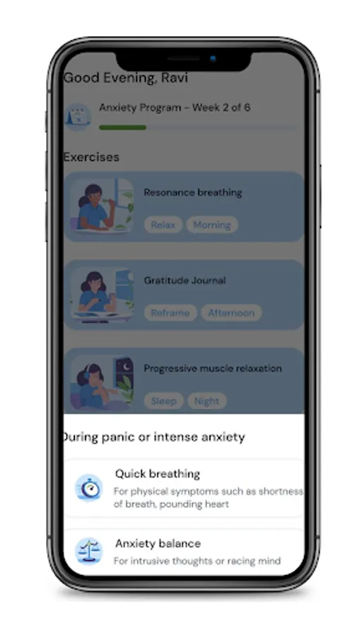 Resony is a digital program that helps you manage worry, anxiety and build resilience. Research-backed and simple techniques of resonant breathing (coherence training), progressive muscle relaxation exercises, gratitude and self-care journal are available to help you get anxiety relief to build resilience. Resony uses an integrated approach and provides the best breathing techniques for anxiety, working with mind-body, to build resilience in a faster and sustainable way. Whether you are waiting for therapy, tired of medication, or want a therapy companion, Resony provides you with help in dealing with stress and panic attack symptoms, as well as instant and effective techniques to help you in relieving stress and achieving peace of mind.