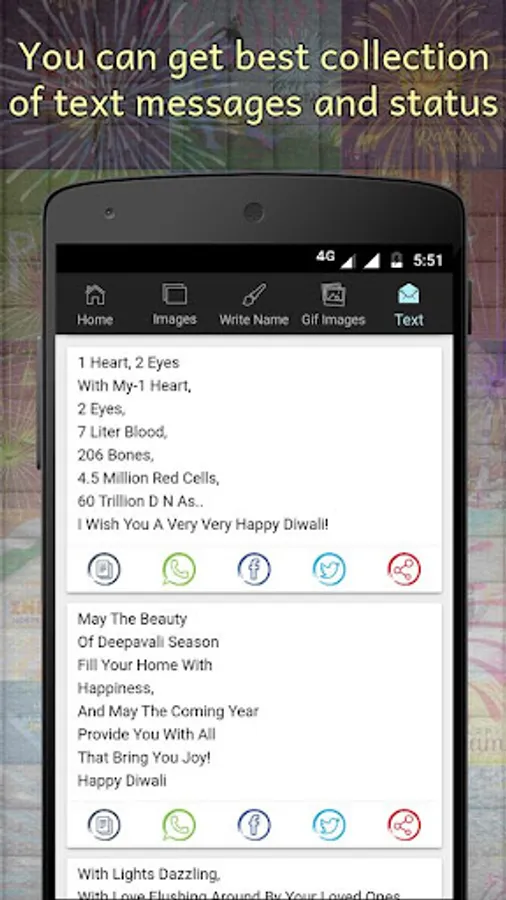When you celebrate Lord Ganesha on Ganesh Chaturthi festival in India, use Ganesh Chaturthi wishes that often include saying "happy ganesh chaturthi". See Ganesh pictures in this cool and cute app. Raksha Bandhan is a very important holiday and it is also known as Rakhi. Search Rakhi in this app and say "happy Raksha Bandhan" to everyone. Other festivals included in this fun app are Dhanteras, Dusserah, great Rama Navami, cute Vasant Panchami, and fun Makar Sankranti.