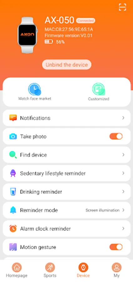 After the app and the smart bluetooth watch are connected via bluetooth, the name and device model of the related smart bluetooth watch will be displayed on the app (eg: AX-050).