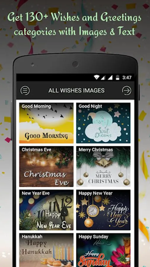 Here you'll find all the amazing greeting pictures and wishes images for almost all the major events and If you think that some categories are missing? then no issues, just send us an e-mail with the category you want us to include & you'll have that category in the application at the earliest.