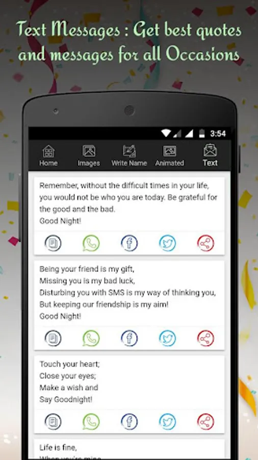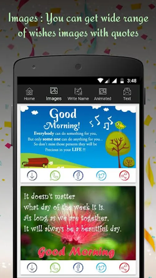 Now, You can easily get variety of Wishes Images, GIF Images, Greeting Cards, Text Messages and Famous Quotes, and you can quickly share it with your friends, family, relative and special ones by single tap using this app on social media network like WhatsApp, Facebook, Twitter..etc that's way you can save your valuable time. so download this small application, and get various categories like Good Morning, Happy Birthday, Happy Diwali, Happy New Year and many others festivals, special days and events.