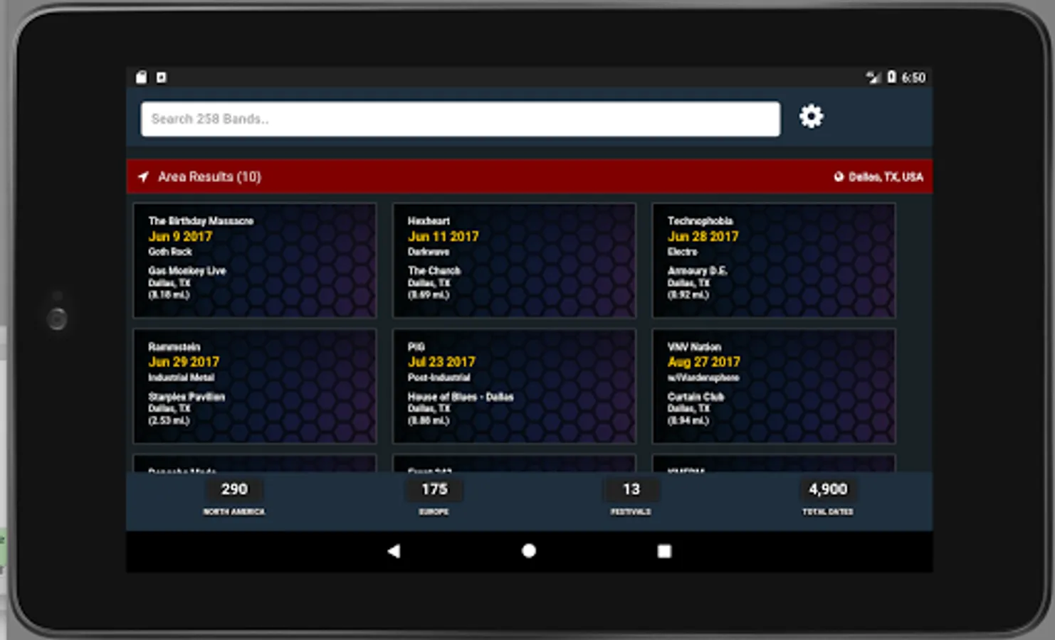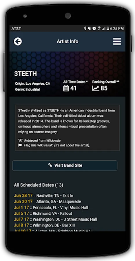 Get push notifications for upcoming shows in your area, new band tours and local one-off events. Browse the worldwide festival list. The app integrates with Wikipedia for available band bios and band origin information. No signup / account required.