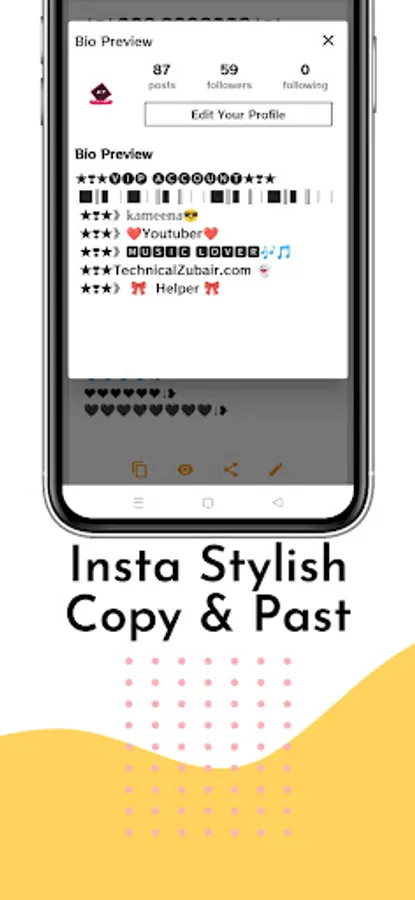 3) Quick copy/share/ button app you can copy the generated text and replace it with your profile name.