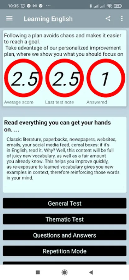 Use your android phone to learn English playing. Enjoy your learning and keep easy tracking of your progress.