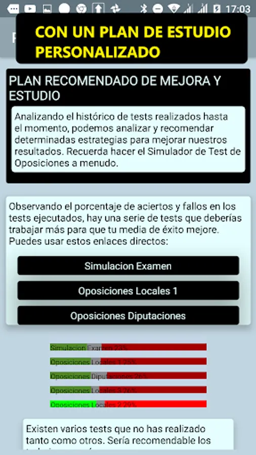 Organizing your activity is also important, not only to work a type of question but to work in an orderly and effective way. For this we include an improvement plan and individualized study where we will propose that you do certain tests taking advantage of the history of tests performed.