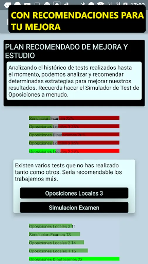 Organizing your activity is also important, not only to work a type of question but to work in an orderly and effective way. For this we include an improvement plan and individualized study where we will propose that you do certain tests taking advantage of the history of tests performed.