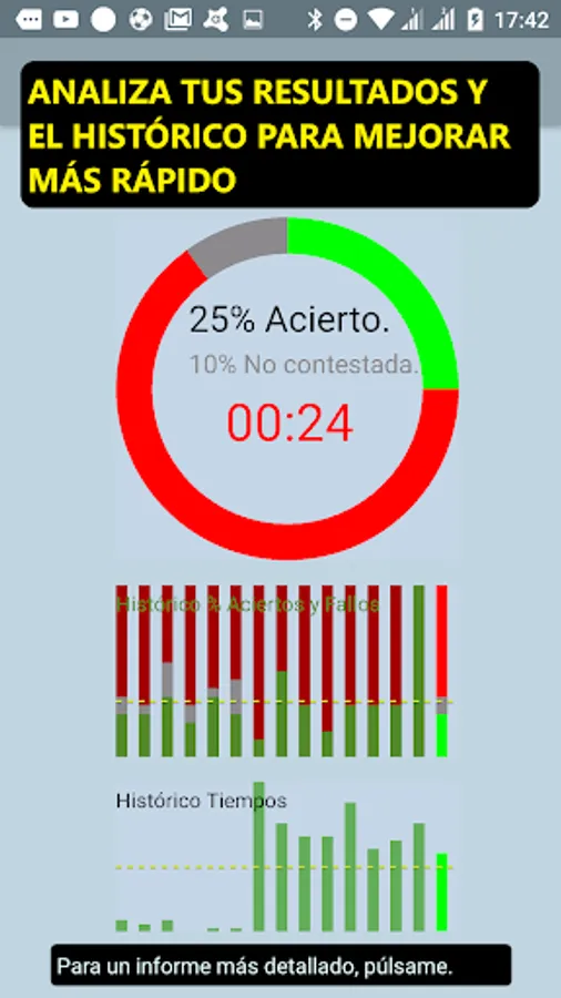 Knowing exactly how well we answer the questions is also very important, so we show you at the end of each test the degree of right and wrong questions, the time it took to take the test as well as a detailed report with the correct questions and answers that You should have responded as well as the ones you failed.