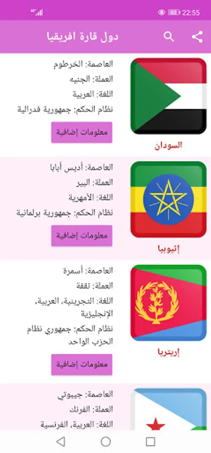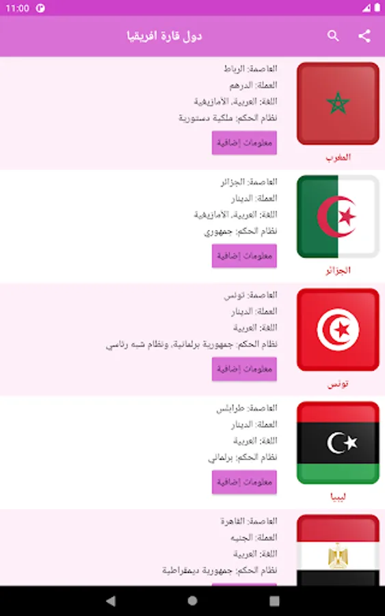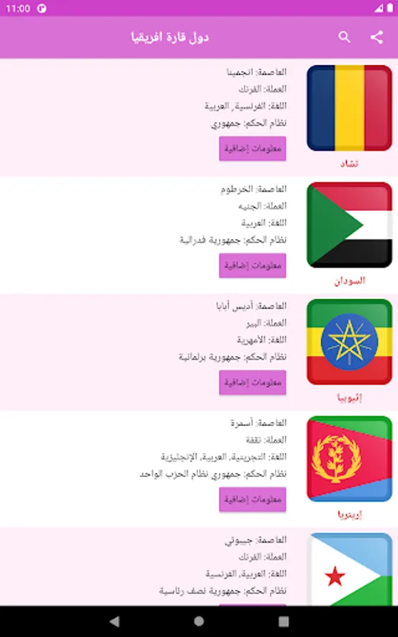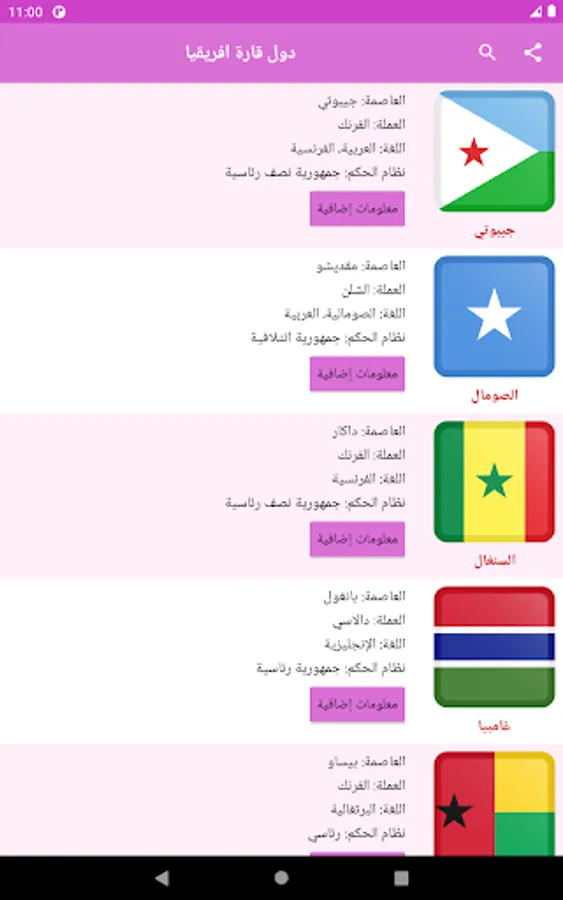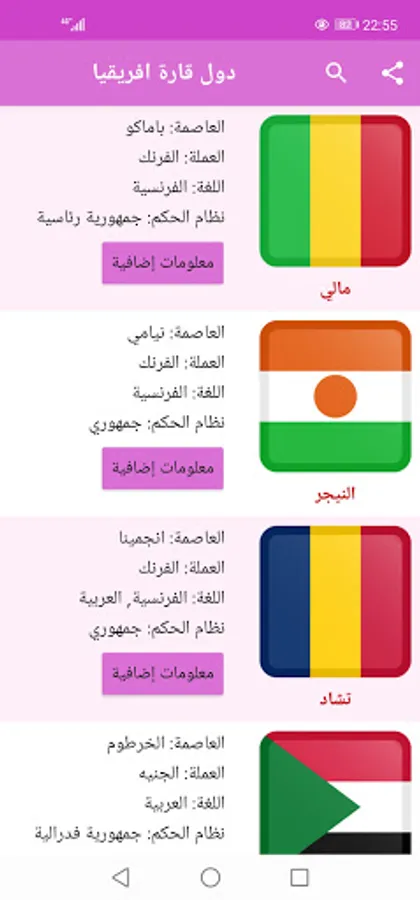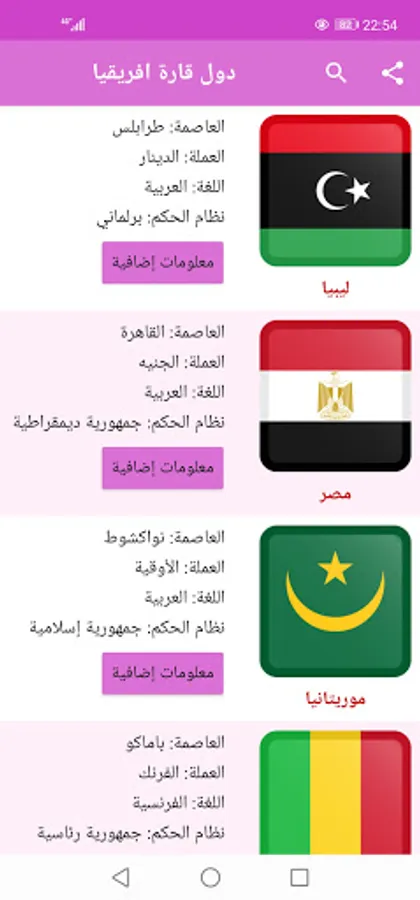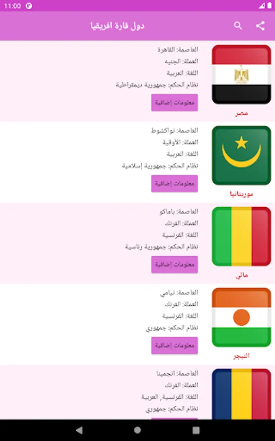 The application includes important and useful information about all countries of the African continent, through which you can learn about the capital, currency, language and rule of each African country.
