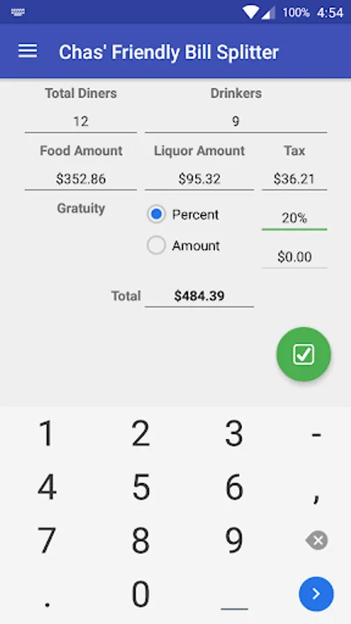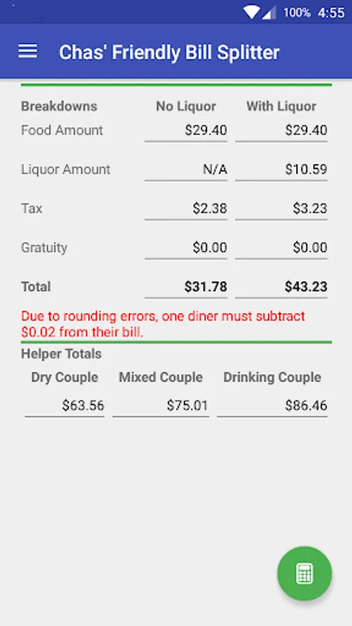 This app can be used to split a restaurant bill among the diners particularly when some are drinking liquor and others aren't. This way you can split the bill equitably.