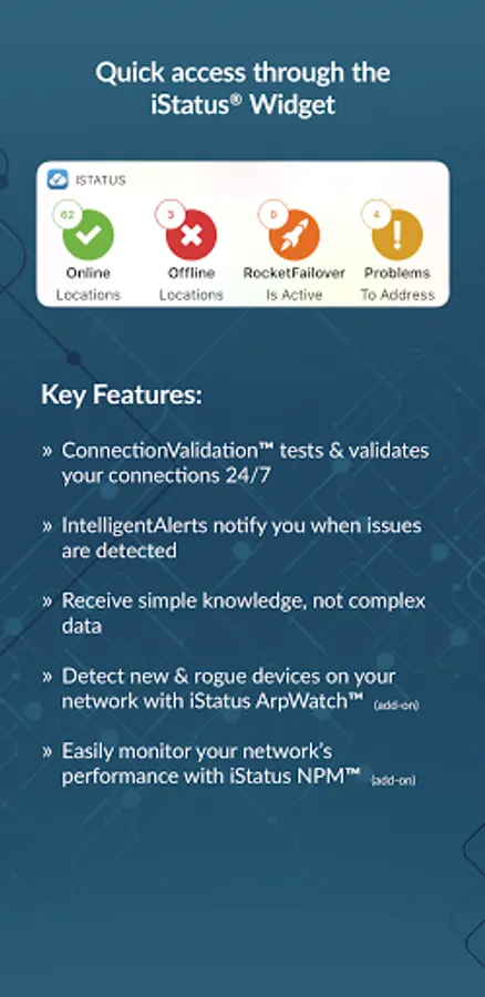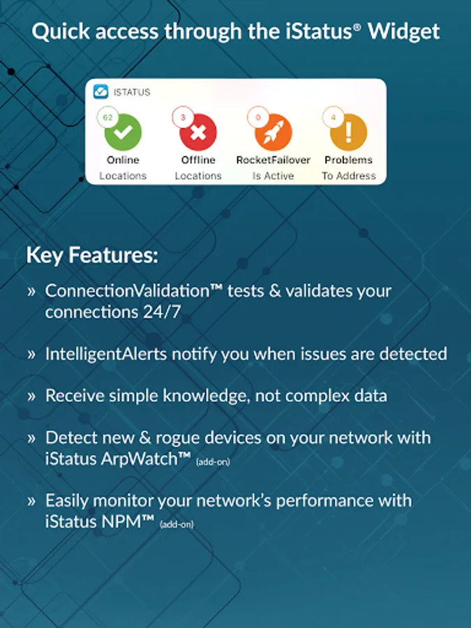 • iStatus IntelligentAlerts™ - keep you up-to-date with the current status of your network connectivity, delivered right to your smartphone, device, or via a bundled email.