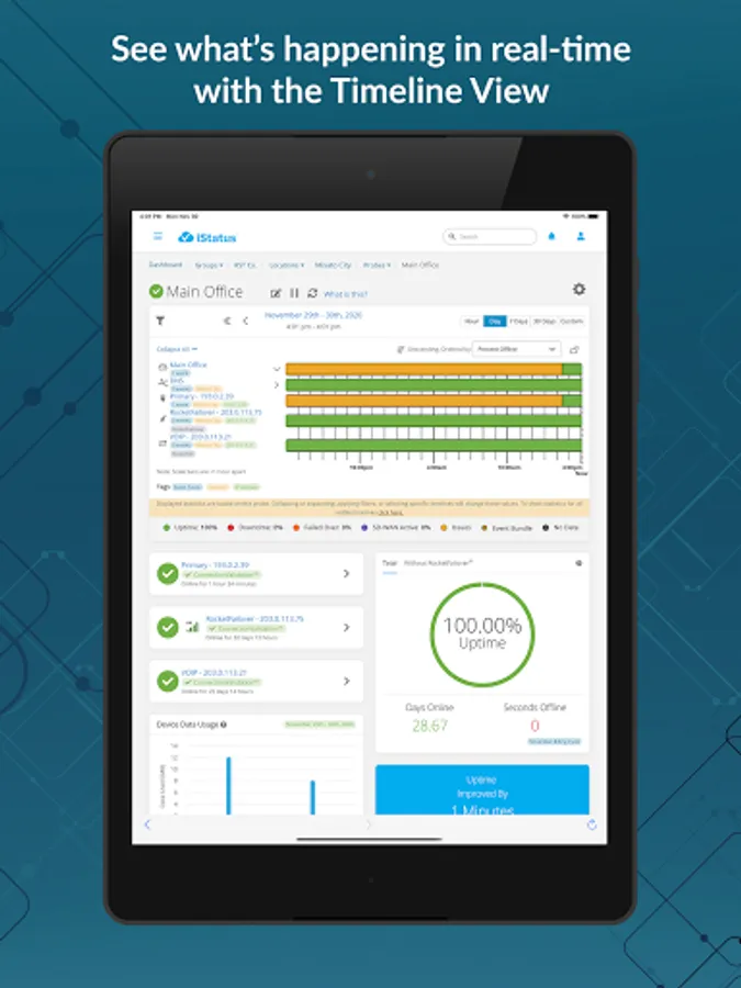 iStatus® is a user-friendly, IoT-based, distributed network monitoring solution. Designed for everyday users and network administrators, iStatus allows you to monitor your Internet connections or network targets from within your network; no messy configurations or compromising your secure networks. Typically, you never know when these networks are offline, experiencing congestion, or new devices were inadvertently connected until it's too late. With iStatus, you'll become the first to know and be able to take appropriate actions immediately, thus shortening downtime, achieving RTOs (recovery time objectives), and saving you money.