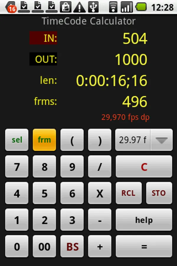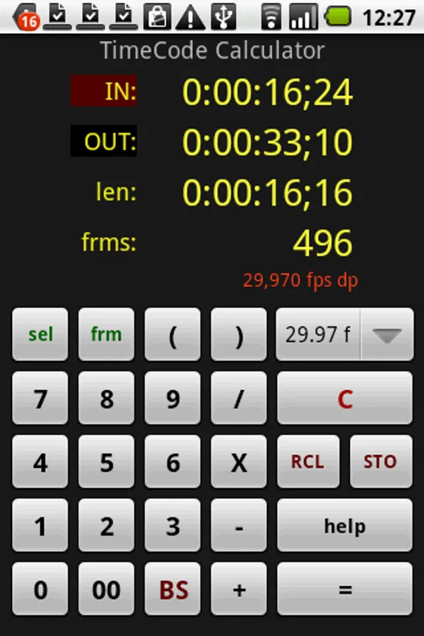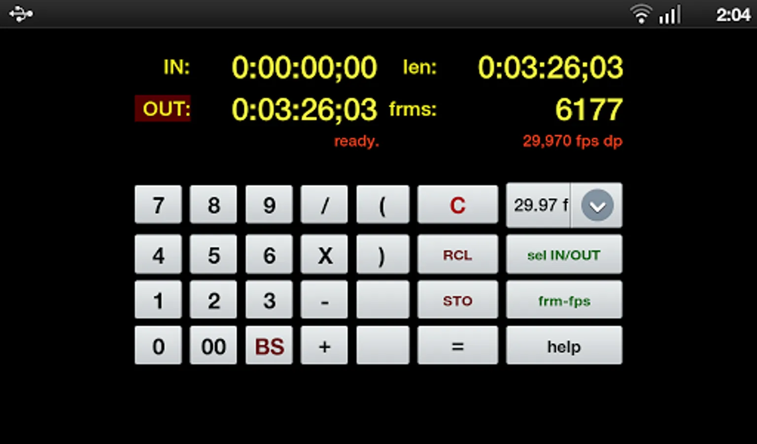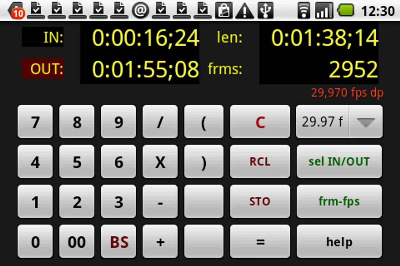 Useful for timecode calculations, with IN and OUT -TC you can convert to or from frames, see differences with fps rate supporting drop and non drop - PAL, NTSC(SMPTE-12M-1-2008). For film and video editing purpose, cutters. Supports +,-,*,/,(),RCL STO. Saves state. Fps: 10,12,15,18,23.976,24,25,29.97,30,50,59.94,60,100...