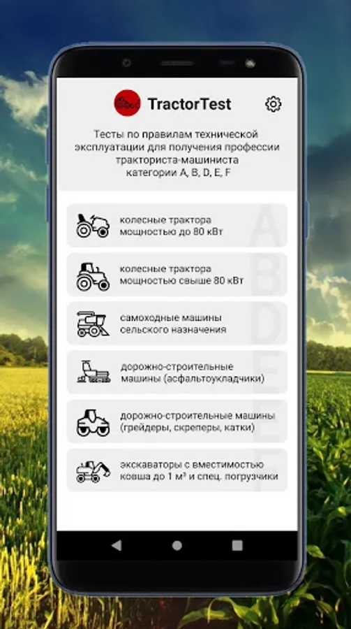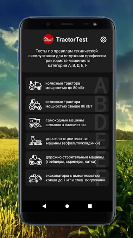 The following categories are available in the application: A - wheeled tractors with a power of up to 80 kW, B - wheeled tractors with a power of more than 80 kW, D - self-propelled agricultural machines, E - road construction and other machines (asphalt pavers, graders, scrapers, rollers), F - excavators with a bucket capacity of up to 1 cubic meter and specialized loaders.