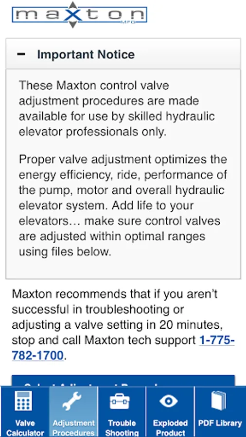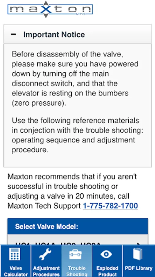 The Maxton Mobile Mechanic APP provides elevator mechanics, service technicians, installers, and other elevator professional’s complete in the field access to all Maxton hydraulic elevator control valve support information on mobile devices without web connectivity.