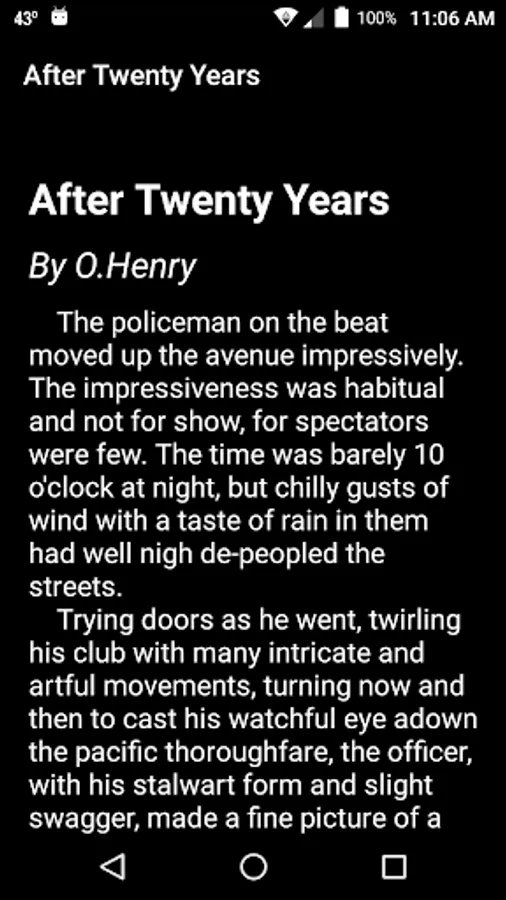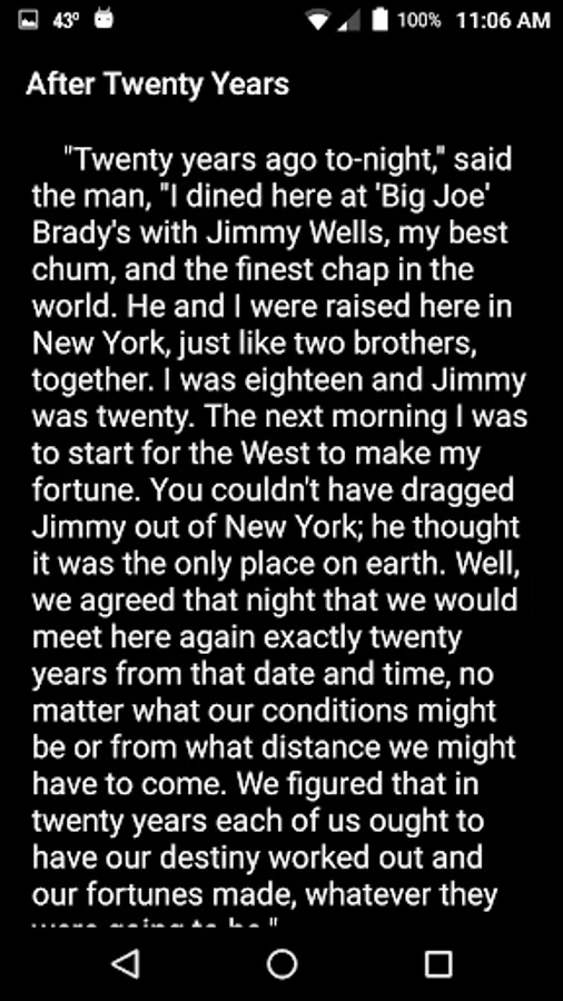 "After Twenty Years" is a short story about two friends reuniting after 20 years in New York.