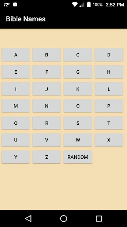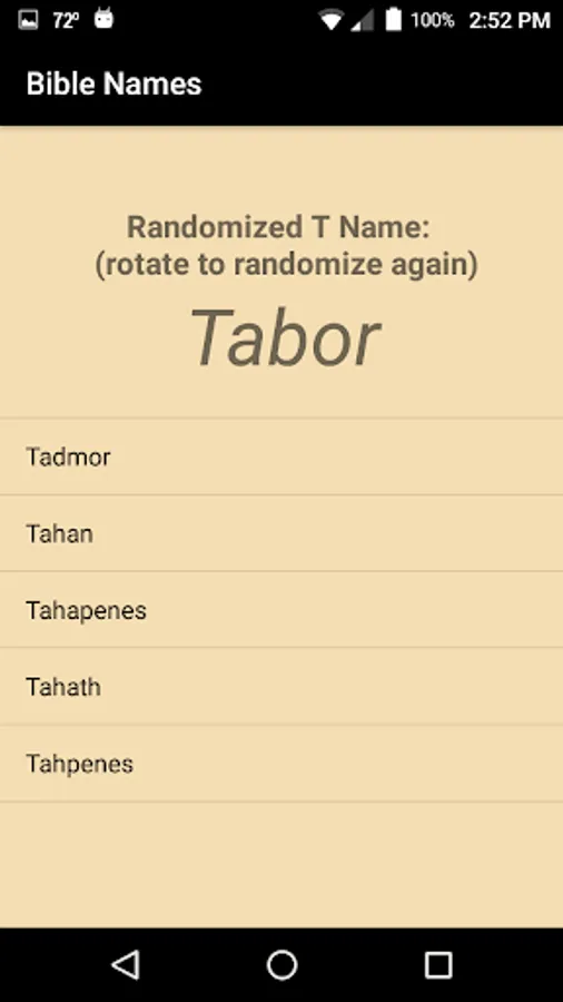 The app provides an alphabetized listing of Bible names, along with a name randomize function.