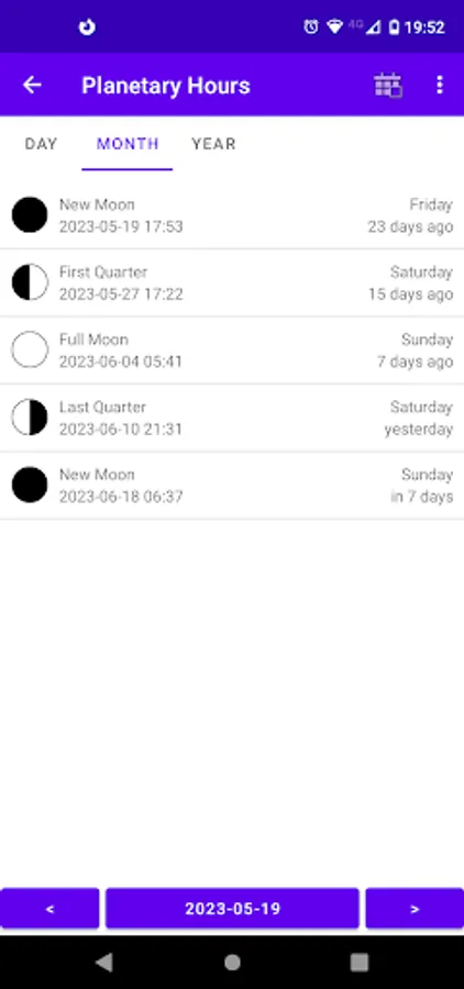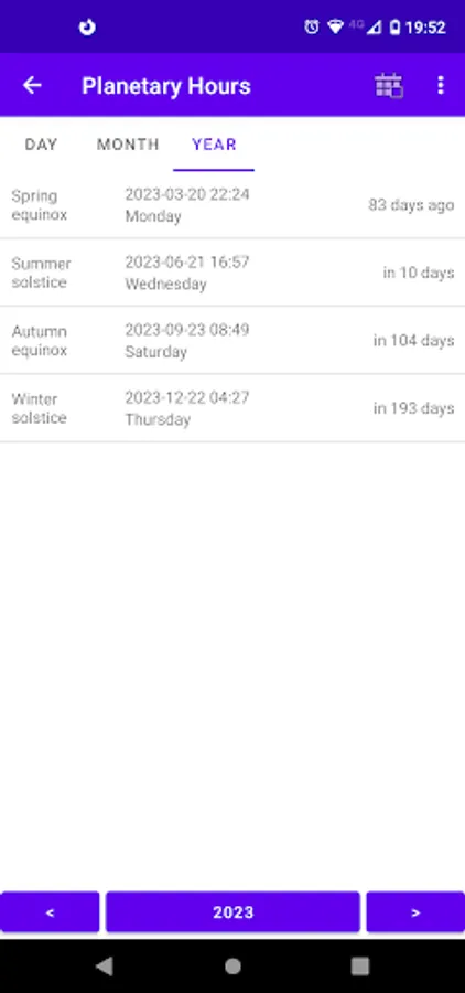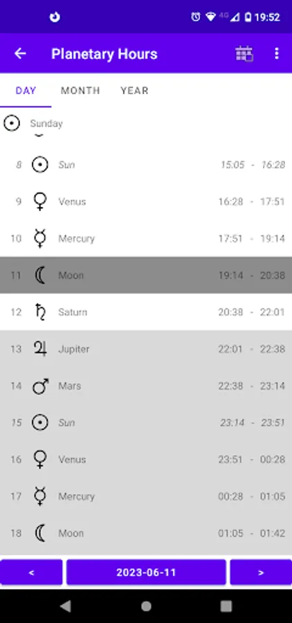 Shows the planetary hours and the date and time of moon phases, solstices and equinoxes for a given location. Shows the correct day of the week for celestial events, according to the system of planetary hours (when the time is between midnight and sunrise it differs from the normal calendar by one day).