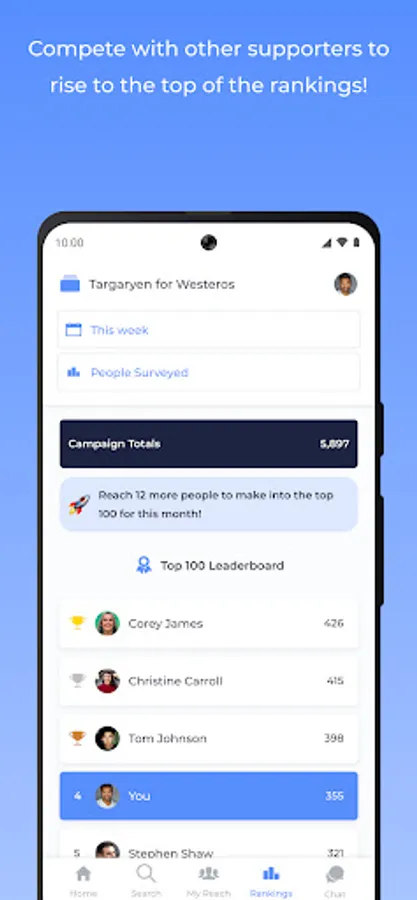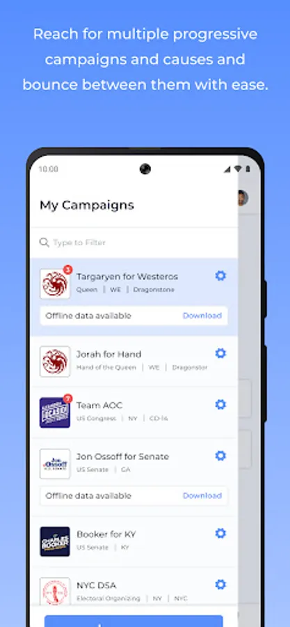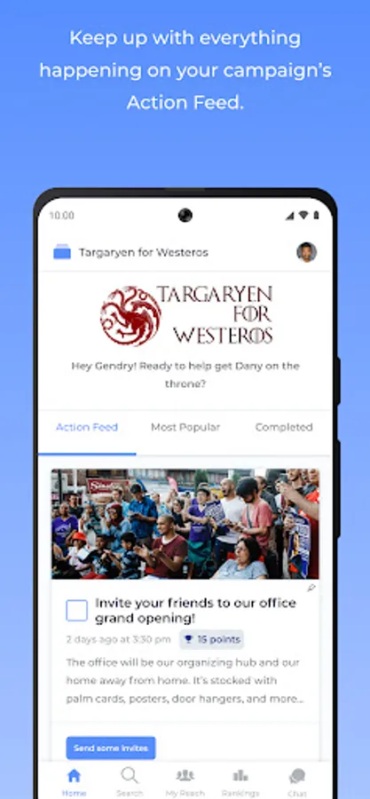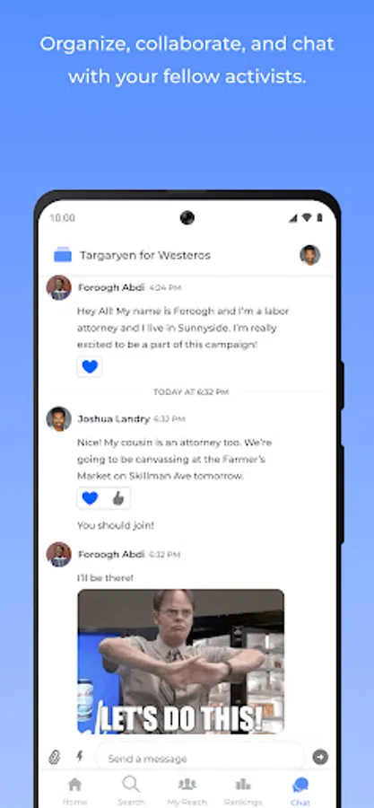 Anyone can download Reach and create an account, but the action begins when your campaign joins the app. Browse our Campaign Directory to see if they’re using Reach yet so they can get you plugged in. You can join as many campaigns as you like with the same Reach account.