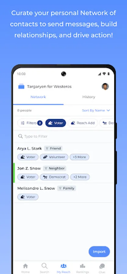 Originally built by Alexandria Ocasio-Cortez's groundbreaking campaign, this canvassing and relational organizing app is changing the way progressives connect with voters and supporters. Reach's direct search features let your team find voters and collect data from them in person or online, turning every voter interaction into a canvassing attempt. The relational organizing features allow each user to build and activate their own personal network of voters including both people they've known for years and new people they meet during their work. The home screen, live chat, push notifications, and gamification make Reach the perfect digital organizing hub for your volunteers and activists. Plus, best-in-class accessibility features like expandable multilingual support, full offline access, and the ability to override core voter file data like dead-names make Reach is an inclusive tool that is welcoming to everyone in the movement.
