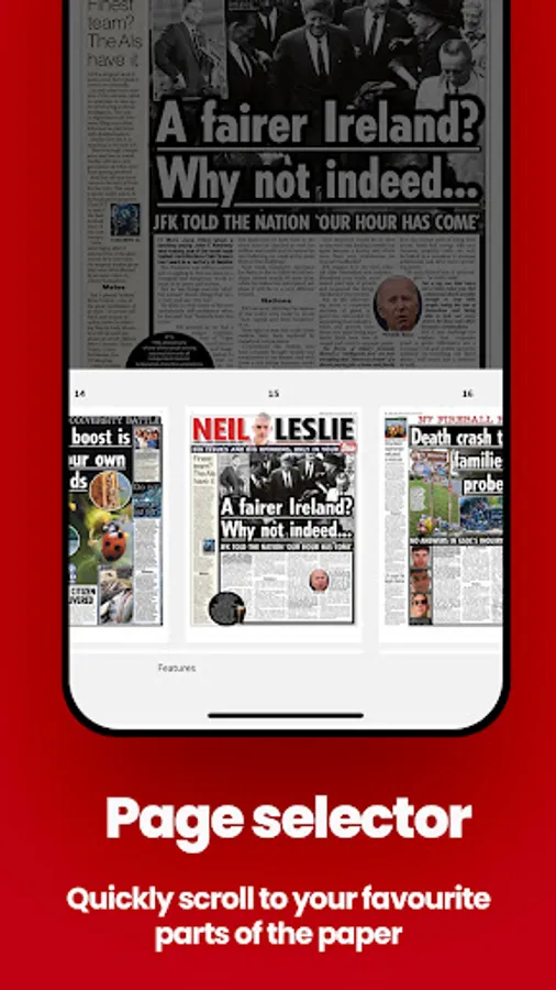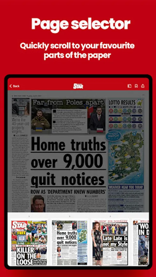 Flip your device and read the newspaper as a double-page spread or full-screen single page, tap the page selector to choose a specific page to fast-navigate to. You can also download and save individual pages to enjoy offline and when you are on the go.