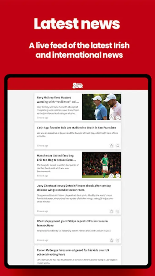 Your Irish Daily Star app features search functionality to find keywords relating to recent content, a zoom function to enable clearer reading of selected articles and social networking integration to keep your friends and social-circles up to date with all the latest shared news from the Irish Star.