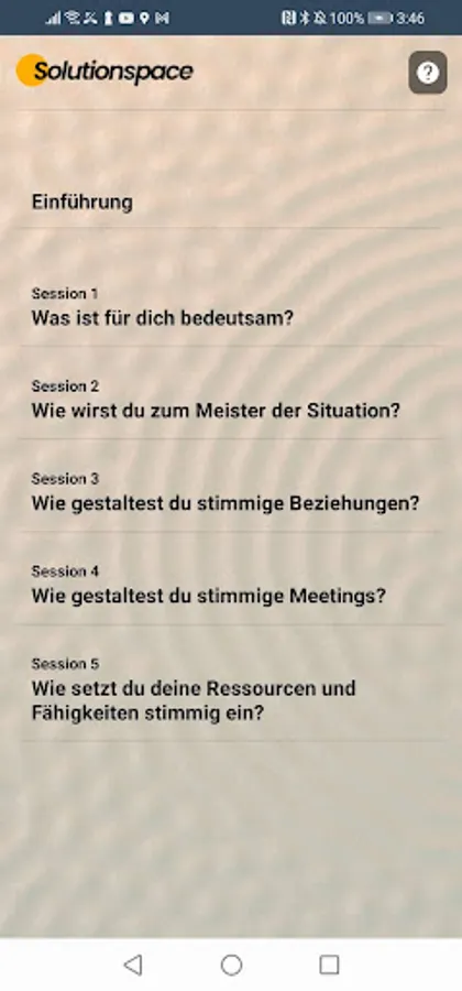 Solutionspace supports you in developing coherent solutions: each session consists of 4 parts: Introduction to the topic, support in generating ideas, help in formulating solutions, concluding an agreement with yourself. In addition, Solutionspace helps you to assess after a certain period of time how much more coherence the solution has brought you.