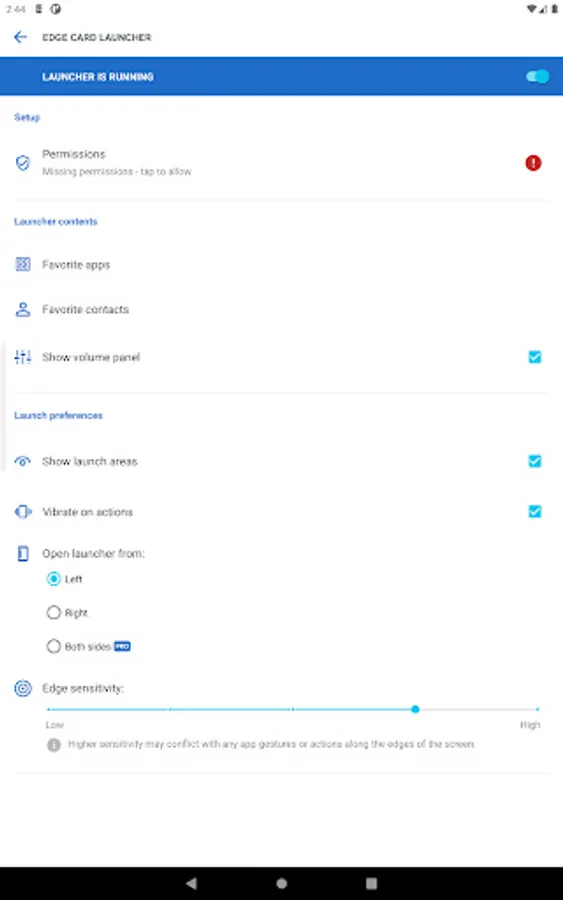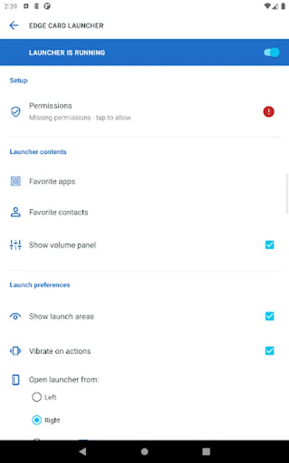 Edge Card Launcher needs one core permission to draw app overlays, and the following optional permissions for full functionality:
