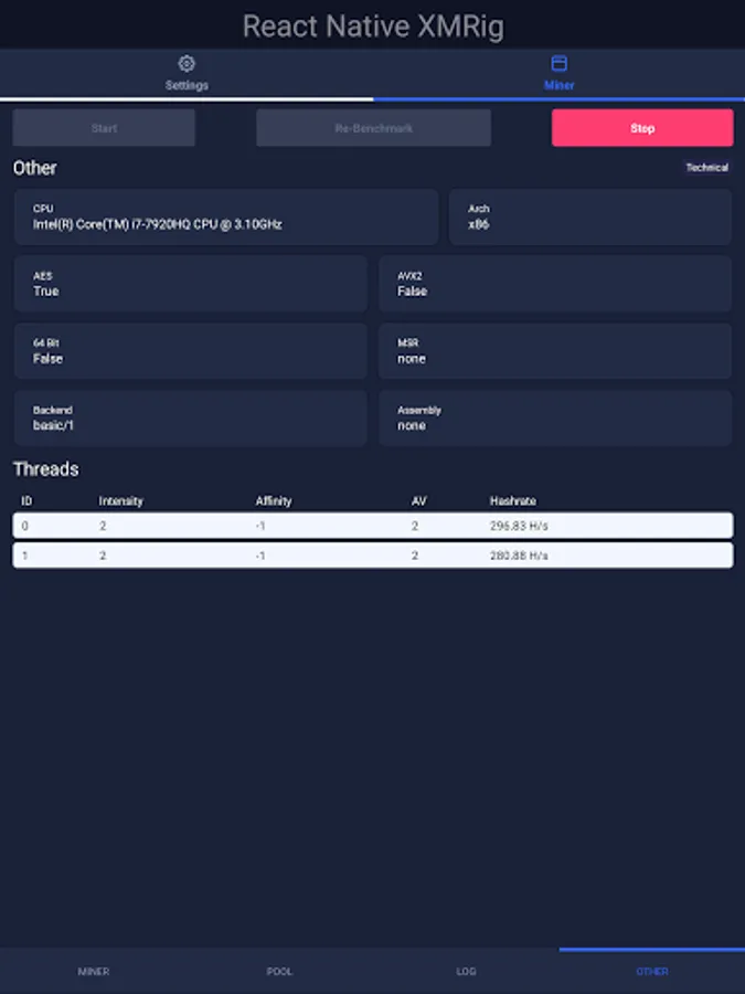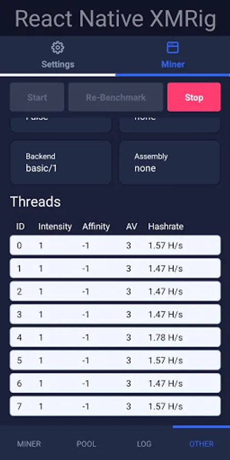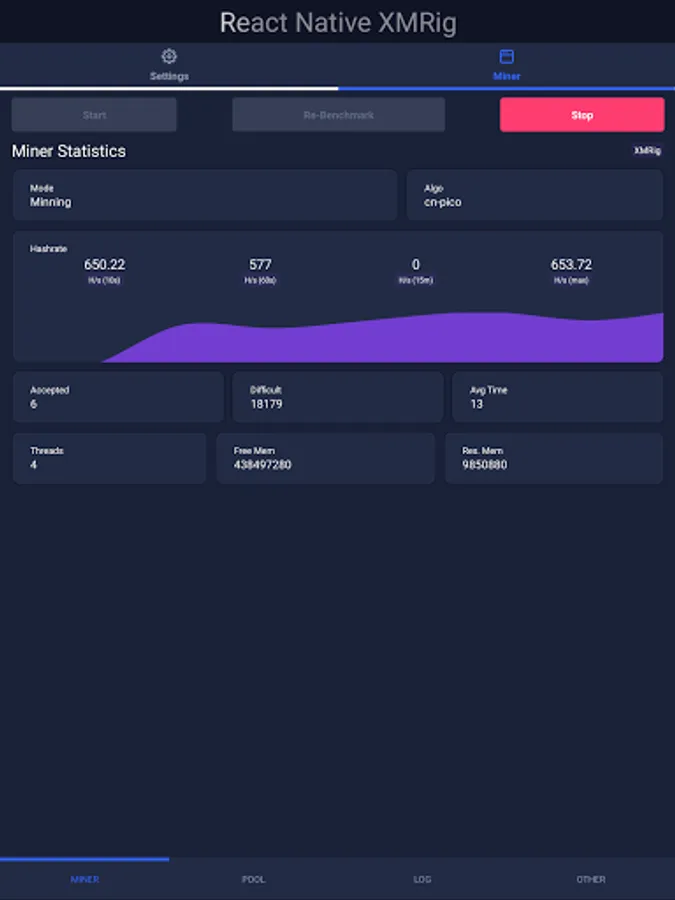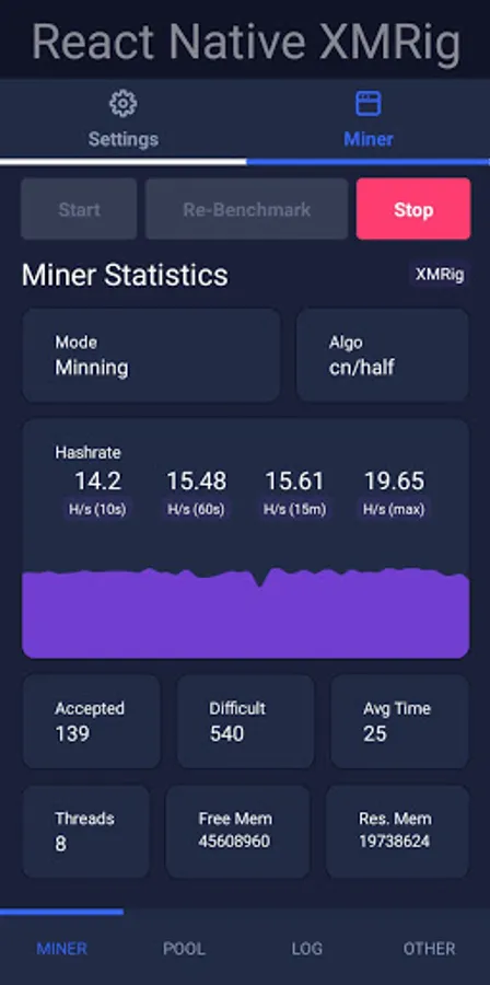 * Miner tab stats: Miner state, Algo, Hashrate histogram, Hashrate (last 10sec, last 60sec, last 15min & max hashrate), Accepted shares, Current Difficult, Avg time for share, Threads, Free mem, Res. mem.