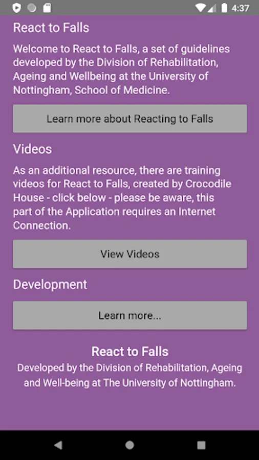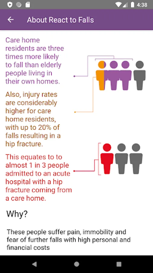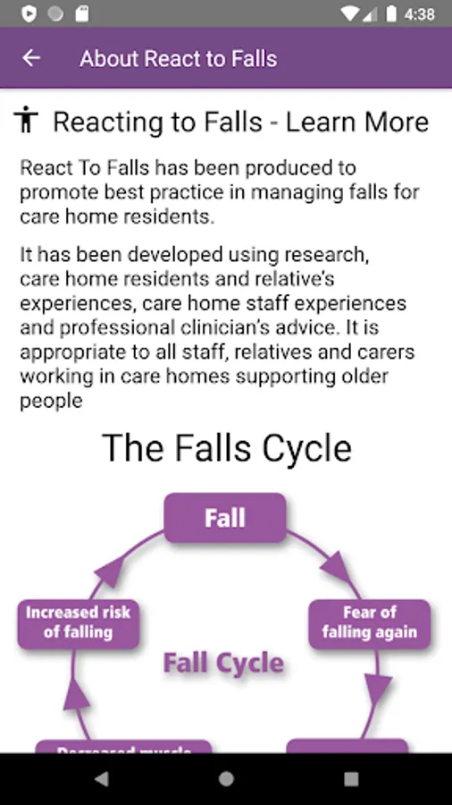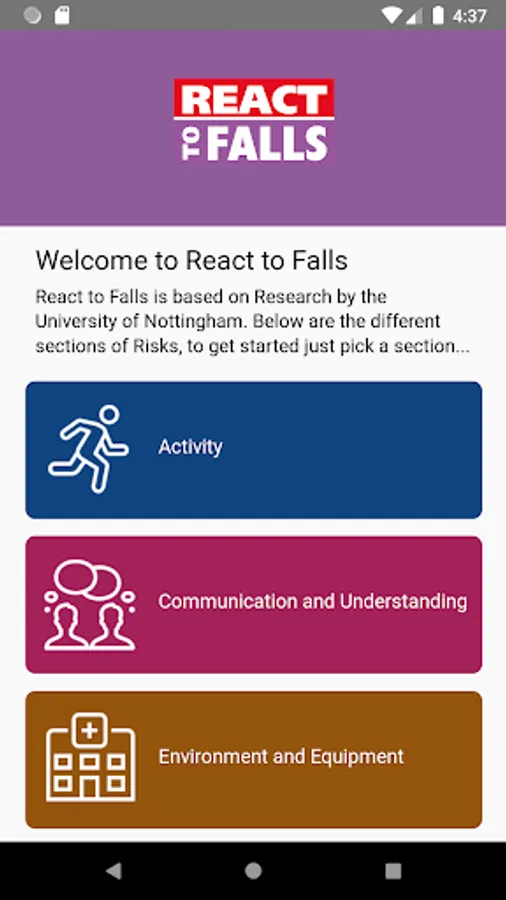 The React To Falls app has been designed using our research evidence and will guide you through different areas of risk that might cause a fall, giving practical tips in bite size pieces of information that have been shown to reduce falls and reduce the effects of falling over.