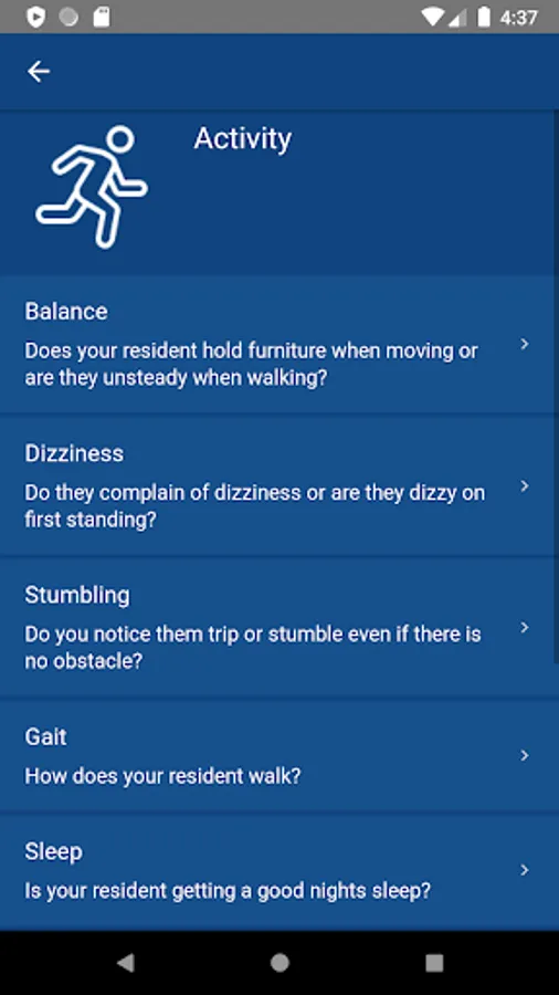 This app can be used by anyone wanting to prevent someone they know having a fall, including residents themselves and their families. It does the following: