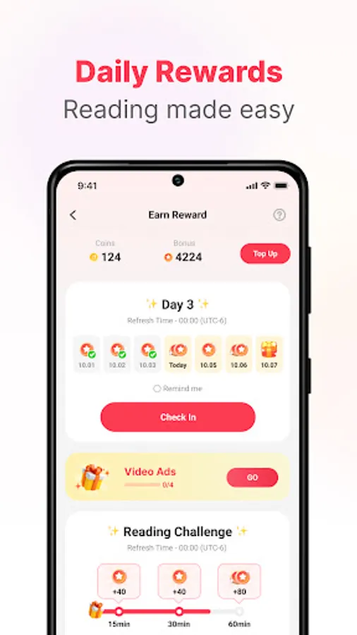 To satisfy the demand of users to read more books, Booklib's Rewards Center offers you great bonuses every day, with small and easy tasks posted every day to provide you with enough bonuses and coins to promote your reading. The more you read, the more bonuses you'll get. Take our reading challenge now and start reading! Likewise, you can earn daily rewards by logging in, or regularly participate in the recharge campaigns we launch. More rewards and unlocking options will be developed in our future updates!