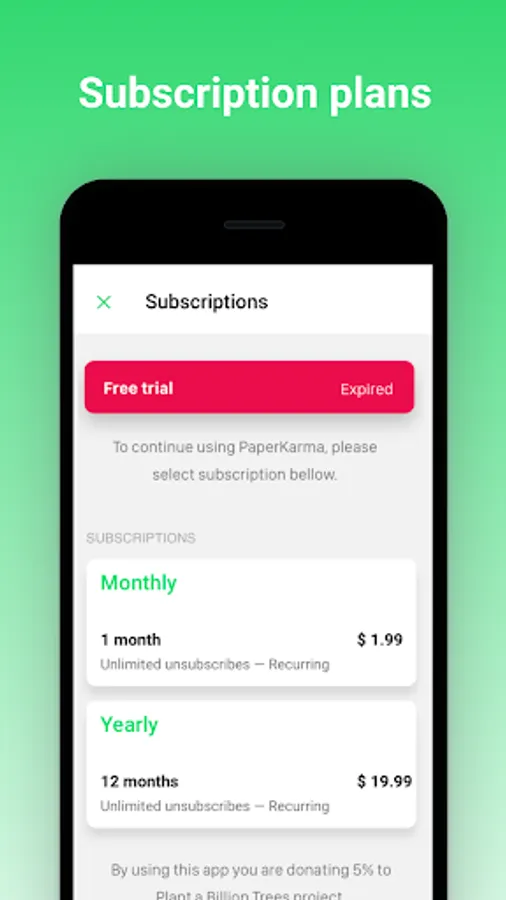 In-app purchase subscription required to use the PaperKarma app beyond the free trial. All users are granted 4 free requests to unsubscribe from postal junk mail, and will be prompted to choose a subscription plan when submitting their fifth request. Subscription plan options include a recurring monthly plan, a 6 month plan, or a yearly plan. We are now offering a Lifetime Plan also, which is a 1-time purchase for lifetime access to the PaperKarma app (unlimited unsubscribe requests).