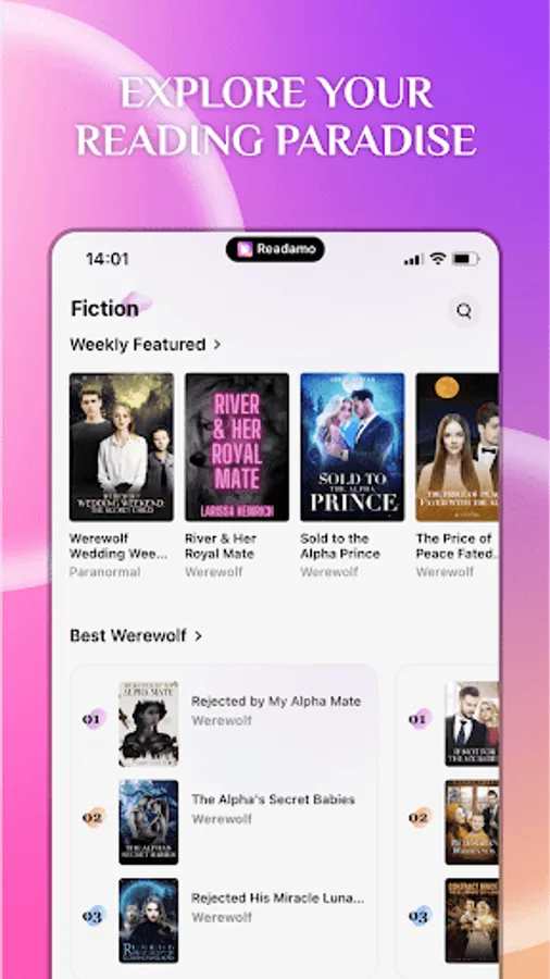 Readamo offers an endless selection of fiction that will satisfy all your literary cravings: Billionaire, Werewolf, Mafia, Bad Boy, Secret Baby, Reincarnation, Second Chance, etc.