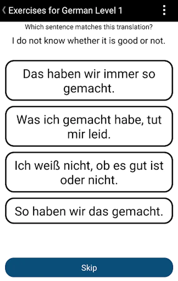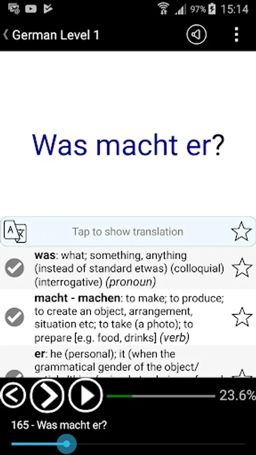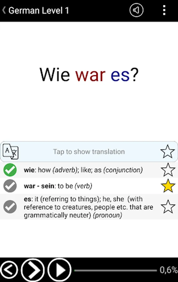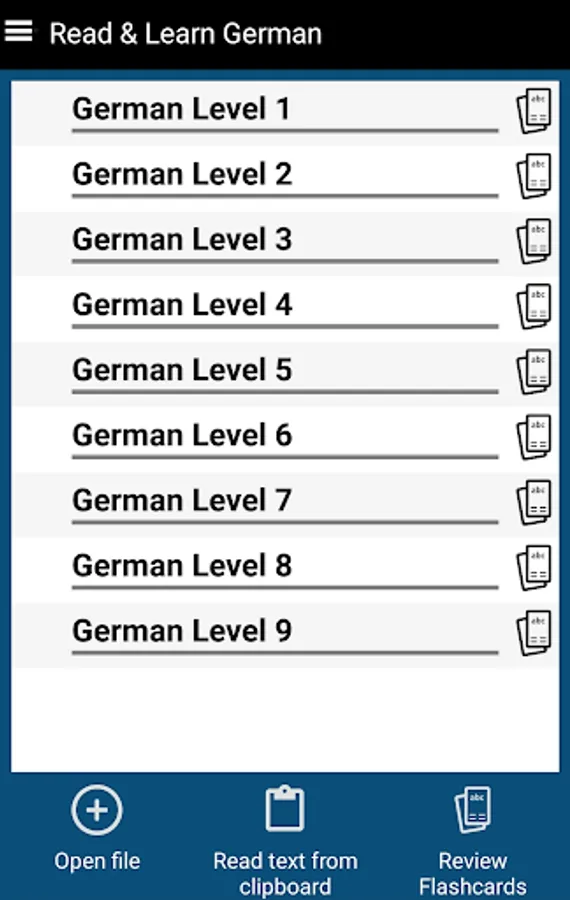 Learn to read German starting from simple sentences, moving on to increasingly more difficult ones - all with English translations and a list of vocabulary on the same page! Like this, even total beginners will be able to start reading instantly. The app keeps track of which words you know, and will only show definitions for words you don't know yet. Flashcards and exercises help reinforce what you've learned while reading, helping you improve both your vocabulary and grammar.