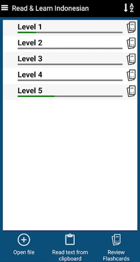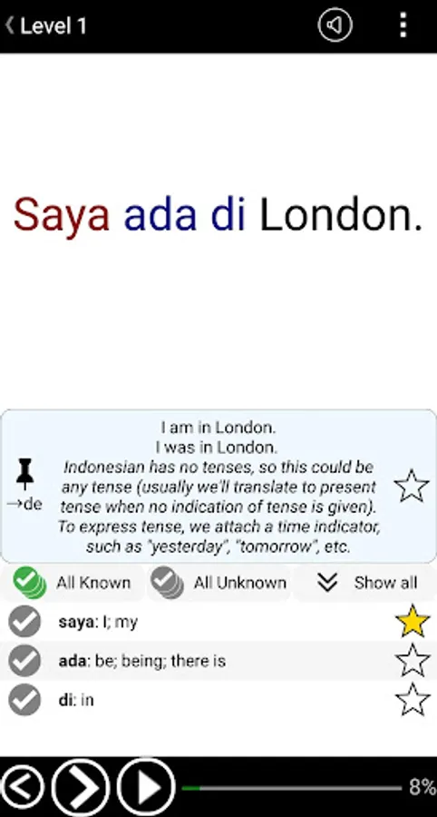 Learn to read Indonesian (Bahasa Indonesia) starting from simple sentences, moving on to increasingly more difficult ones - all with English translations and a list of vocabulary on the same page! Like this, even total beginners will be able to start reading instantly. The app keeps track of which words you know, and will only show definitions for words you don't know yet. Flashcards and exercises help reinforce what you've learned while reading, helping you improve both your vocabulary and grammar.