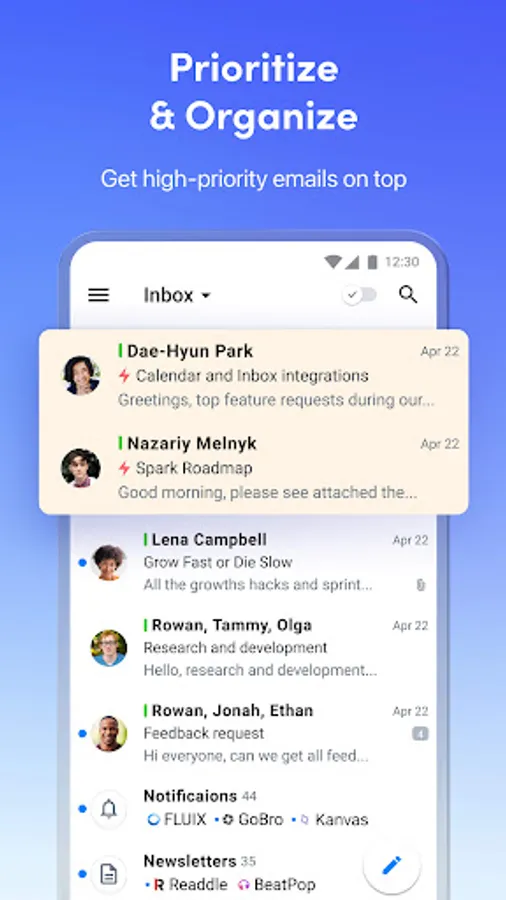 Focus on what’s important, boost your productivity and organize your email workflow. To get better mailbox control, Spark mail app pulls personal and high-priority business emails to the top of your inbox. Use Spark + AI email to prioritize, organize or clean emails. Get better mailbox control and connect multiple email accounts in one inbox.