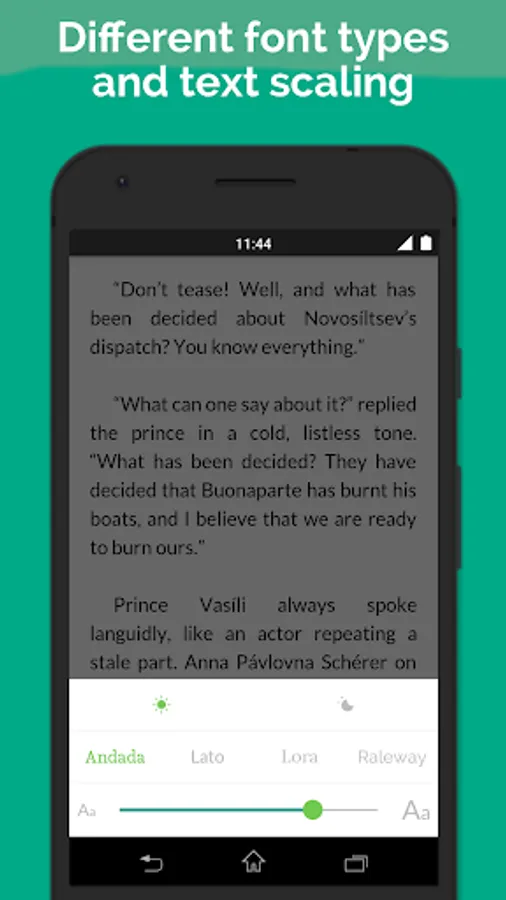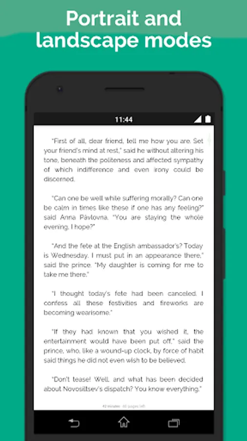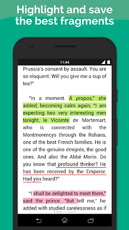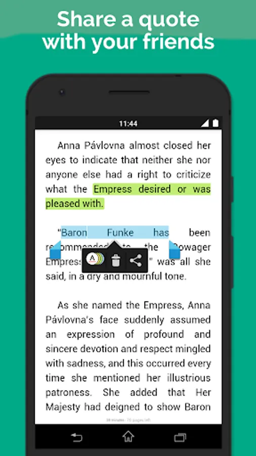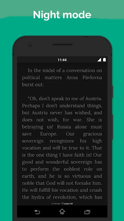 Rich and powerful text-editing functionality including multicolored highlighting tools: copy, define, share a quote just with one tap! Save any fragment of the text for the quick access in the bookmarks. Use night mode to read anytime anywhere and control the time of your reading - bottom bar shows you the number of pages remaining and estimated minutes to the final based on your reading speed.