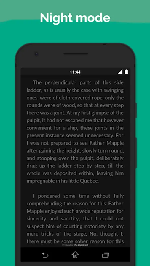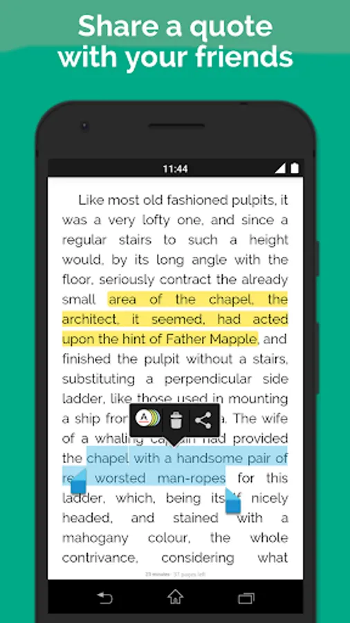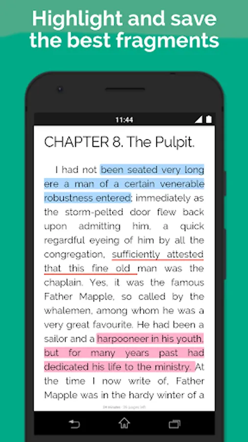 Rich and powerful text-editing functionality including multicolored highlighting tools: copy, define, share a quote just with one tap! Save any fragment of the text for the quick access in the bookmarks. Use night mode to read anytime anywhere and control the time of your reading - bottom bar shows you the number of pages remaining and estimated minutes to the final based on your reading speed.