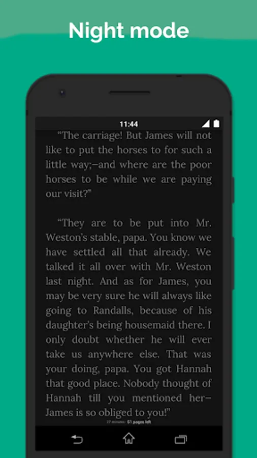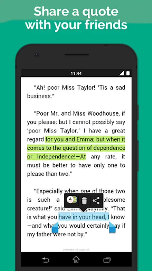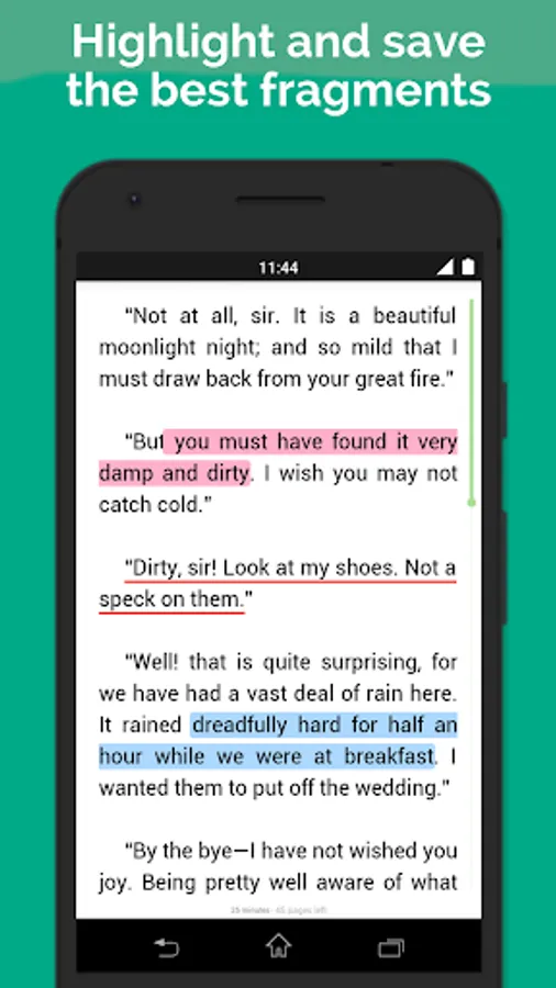 Rich and powerful text-editing functionality including multicolored highlighting tools: copy, define, share a quote just with one tap! Save any fragment of the text for the quick access in the bookmarks. Use night mode to read anytime anywhere and control the time of your reading - bottom bar shows you the number of pages remaining and estimated minutes to the final based on your reading speed.