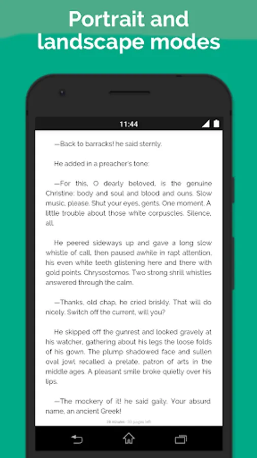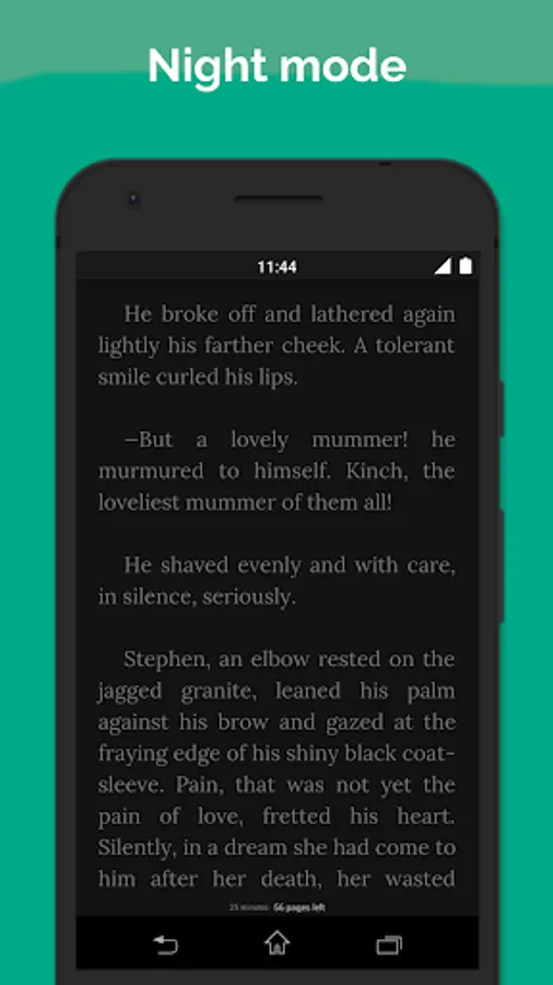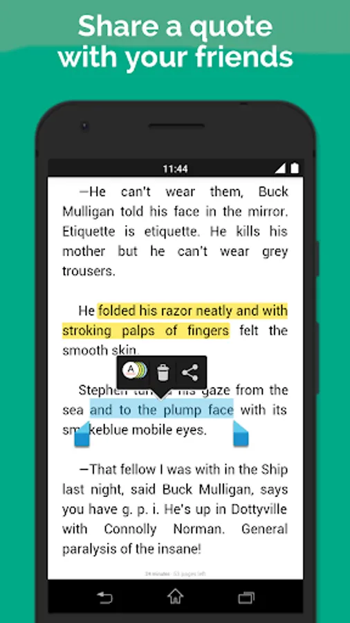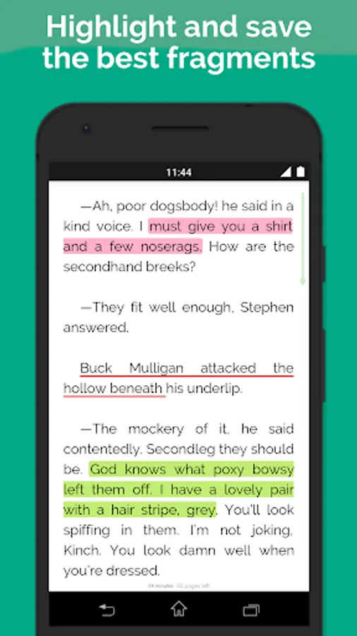 Rich and powerful text-editing functionality including multicolored highlighting tools: copy, define, share a quote just with one tap! Save any fragment of the text for the quick access in the bookmarks. Use night mode to read anytime anywhere and control the time of your reading - bottom bar shows you the number of pages remaining and estimated minutes to the final based on your reading speed.