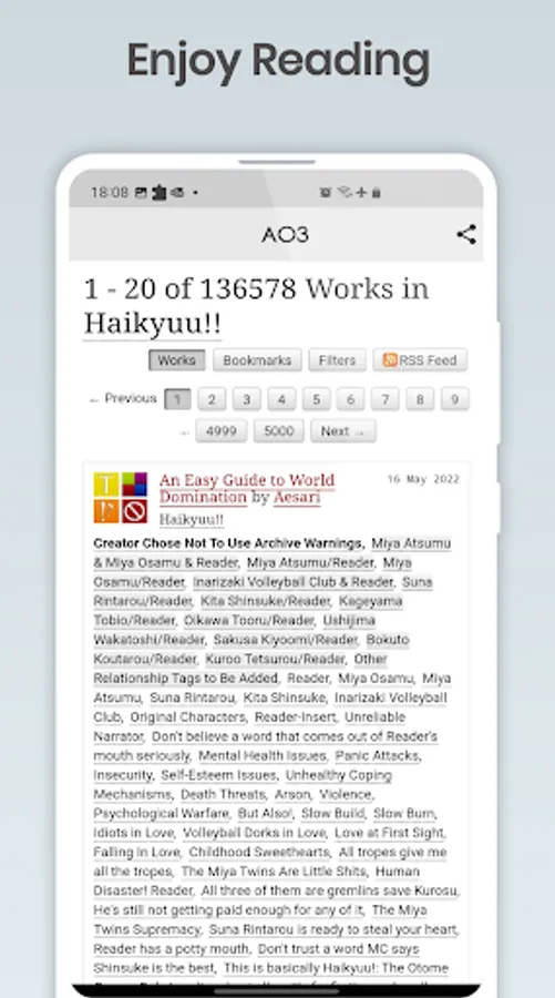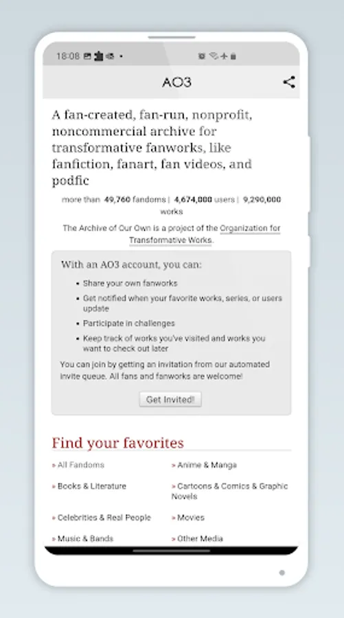DISCLAIMER: THIS IS NOT AN OFFICIAL APP, We are not affiliated with Archiveofourown.org, this app is developed by Archive of Our Own (AO3) fan for AO3 Android users.
