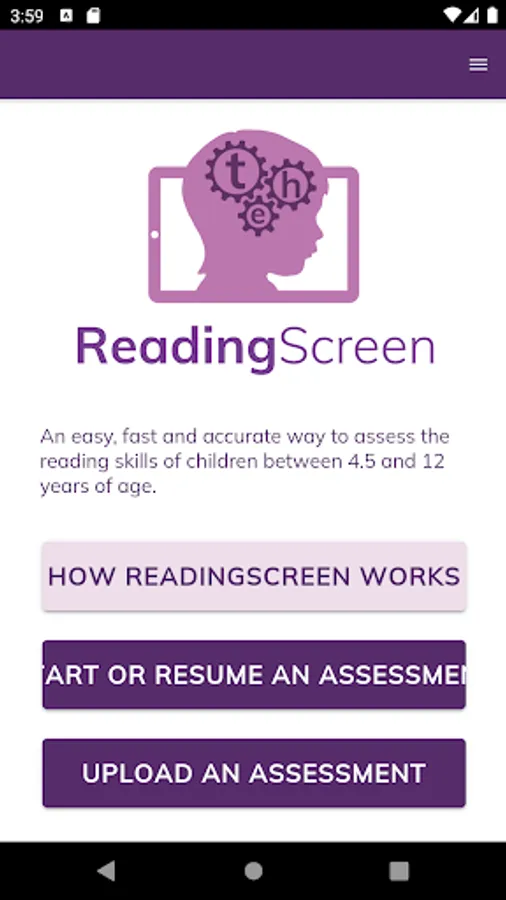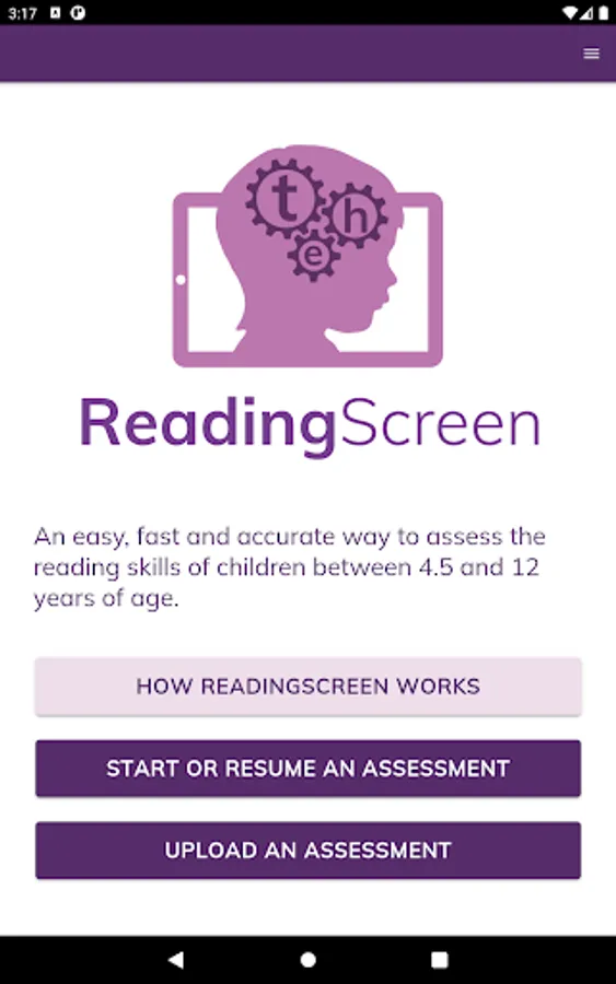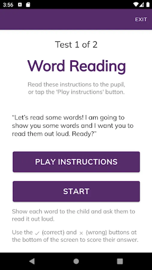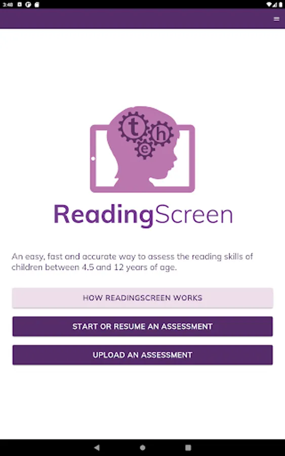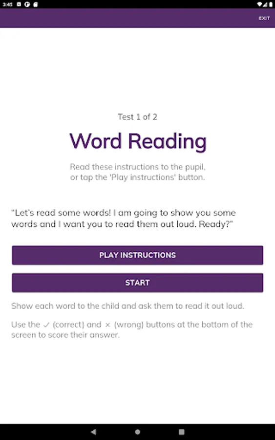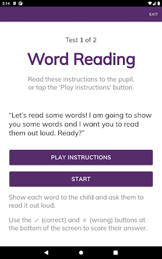 ReadingScreen assessments consist of two short tests. The first presents pupils with up to 60 individual words of increasing complexity. The second is similar, but presents them with up to 34 made-up non-words. The pupil is asked to read each word out loud and their responses are marked either Correct or Incorrect by the adult. If they get 8 answers in a row incorrect, the test ends. Each assessment should take 10 minutes or less to complete. Assessments can be interrupted if necessary and will resume from the beginning of the most recent test.