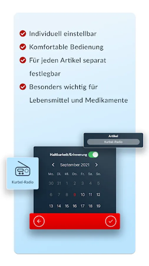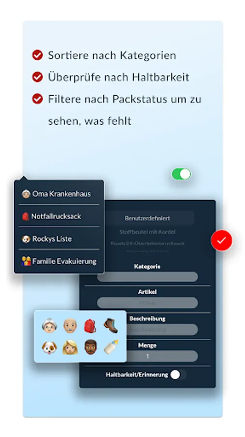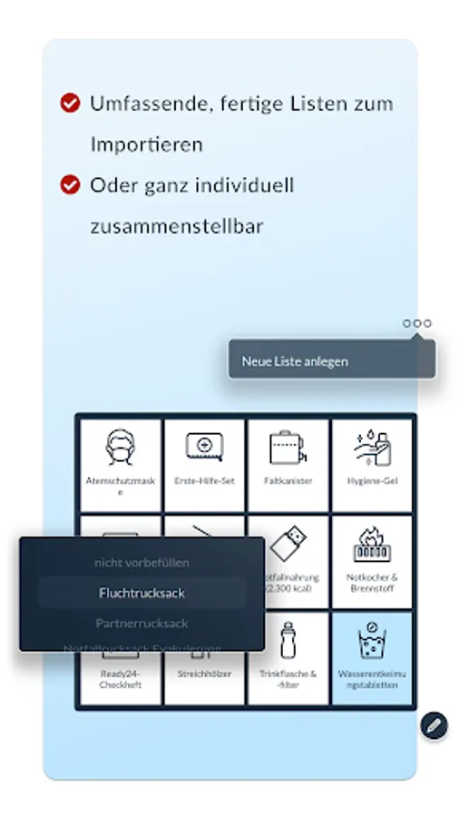 Pack your escape backpack in a few minutes, thanks to the Ready24 packing list. You will receive free tips on how to behave in various emergency situations. There are also useful tips on how to use your survival equipment. Now with a reminder function when products in your emergency backpack expire and you should replace your emergency ration or other equipment.
