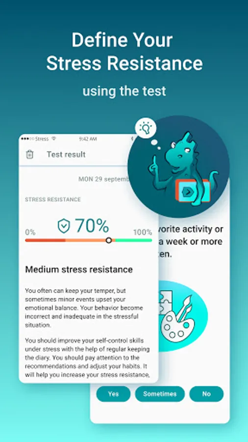 Your stress resistance depend on your lifestyle and habits. Stress resistance test will define it. After taking the test, you will get individual recommendations for increasing your stress resistance and mental health! You will be able to track your stress resistance changes in the statistics of journal!
