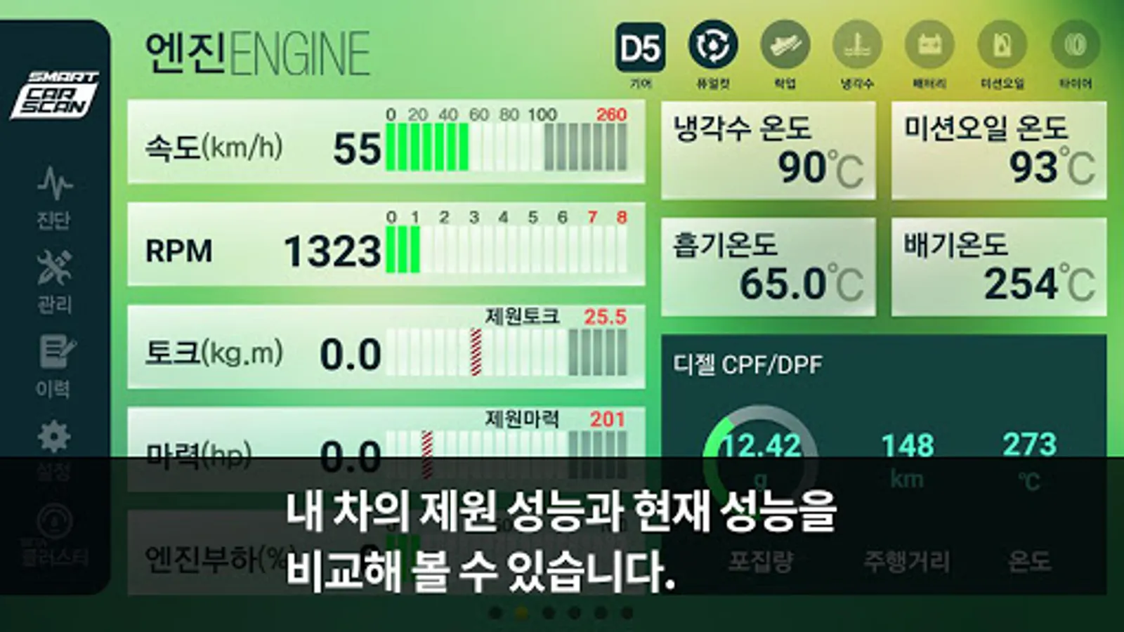 또한 엔진 부하율과 대기압, 흡기온도, 대기온도, 촉매온도, 디젤차량의 CPF, DPF 포집량 등을 제공하여