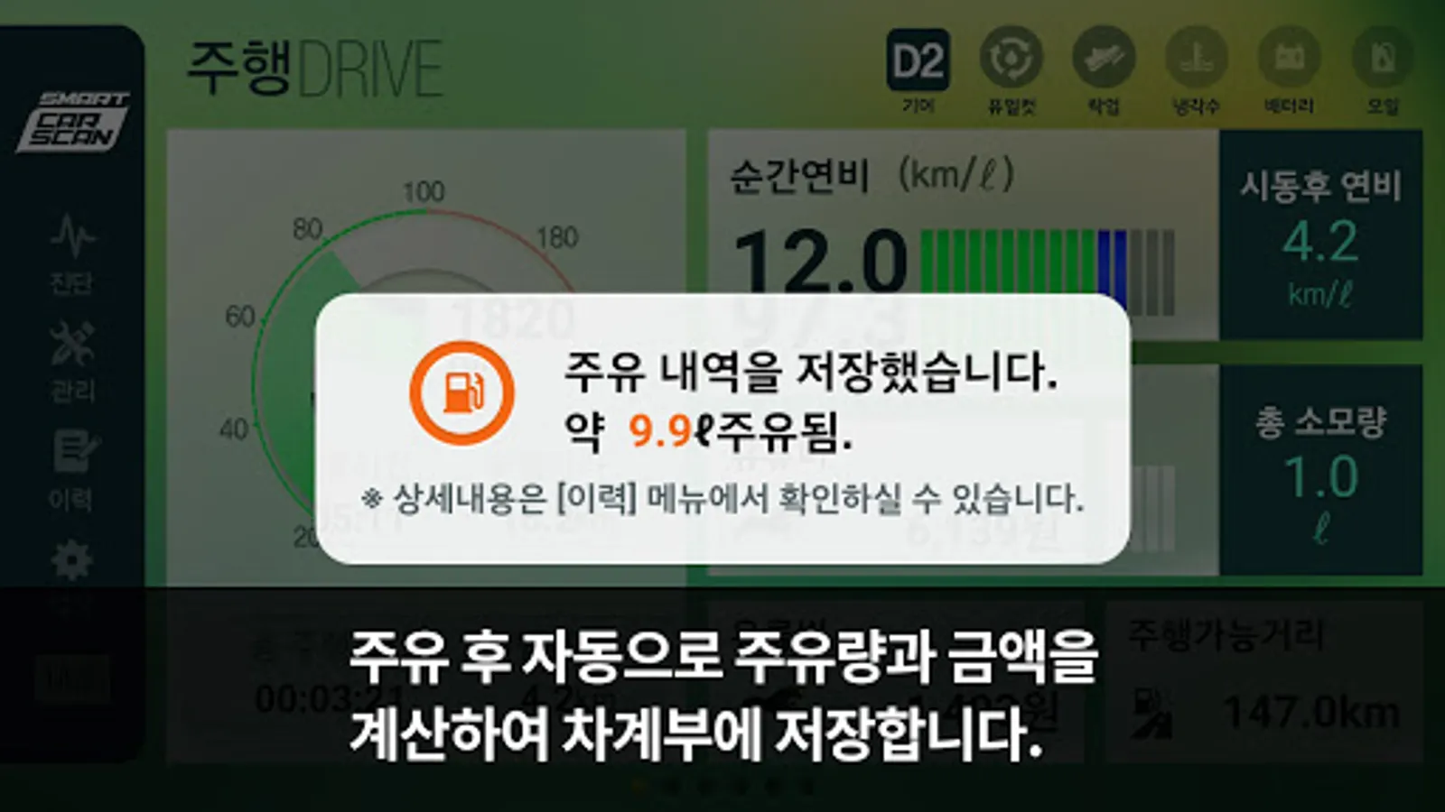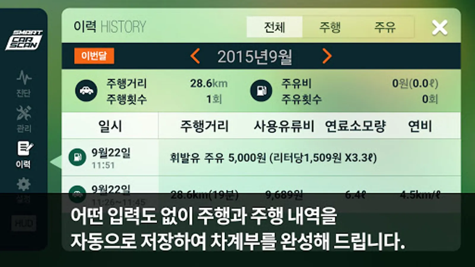 - 주행 종료 시 주행 거리와 연료 소모량이 자동으로 저장되고, 주유 시 주유된 연료량을 자동으로 저장하여 별도의 차계부 관리가 필요 없습니다.